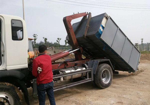 上装配置:高强度合金钢一体式主勾臂,加强型副梁,铸钢尾托轮,手动+电控双操控装置, 液压完成上箱+下箱+锁紧+自卸等作业,实现一车配多箱的循环转运。