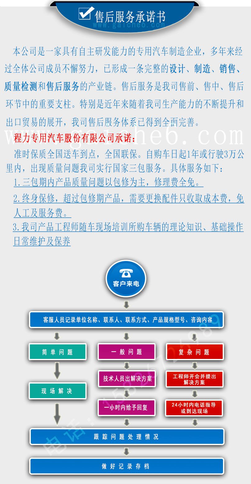本公司是一家专用汽车企业。多年来经过公司全体员工的不懈努力,已形成一条完整的设计、销售、质量检测和售后服务的产业链。售后服务是我公司售前、售中和售后环节中的重要支柱。特别是近几年来随着公司能力的不断提升和出口贸易的展开,售后服务体系得到了完善。